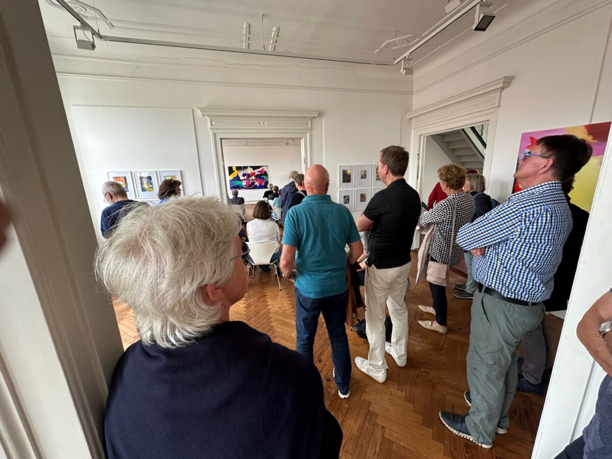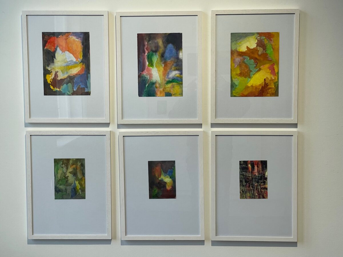 Schließlich betreten wir einen Raum mit kleinen Aquarellen en bloc: Malerei, vermeintlich schnell dahingeworfen, bunt, in Schichten überlagernd, begrenzend, erweiternd. Hier untersucht Paduck intuitiv mit seiner jahrzehntelangen Erfahrung das Wechselspiel aus Farbe und Fläche, indem er übermalt, kontrastiert, in Beziehungen setzt. Diese Experimente in Aquarell sind für sich autonome Malerei und zugleich Keimzelle, in Teilen auch Inspiration für die größeren Gemälde aus jüngster Zeit in Acryl auf Leinwand: Farbflächen greifen ineinander – Gelb drängt nach vorne, Rot folgt langsam in dieselbe Richtung, Grün ruht, während Blau in die Tiefe des Raumes zieht und zugleich auch in uns tief eindringt, tief in uns Hall erzeugt. Uwe Paducks Malerei berührt!