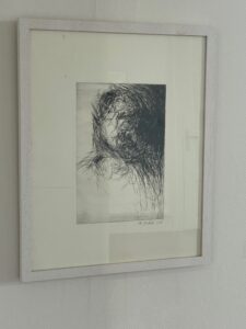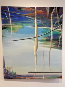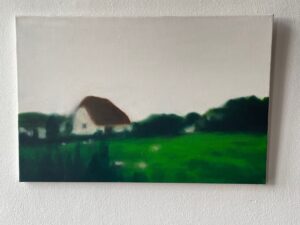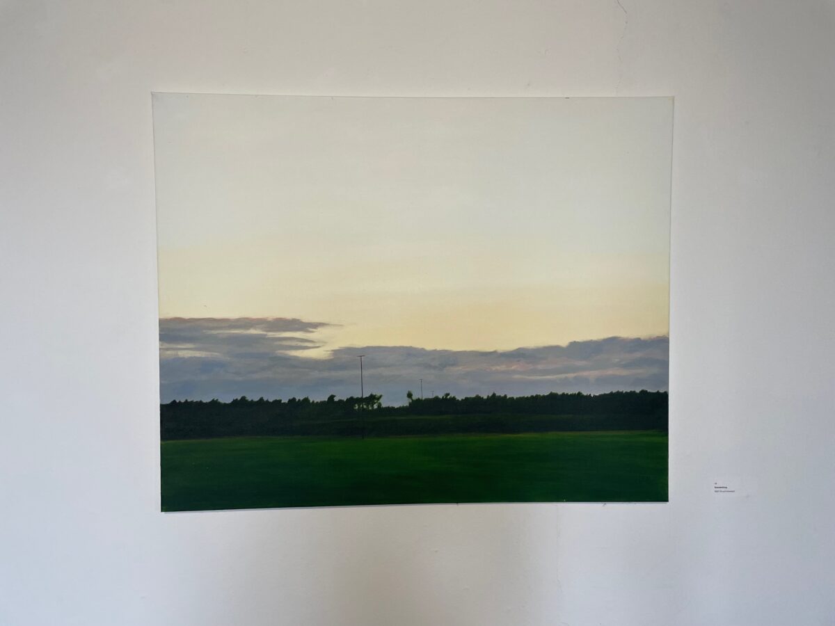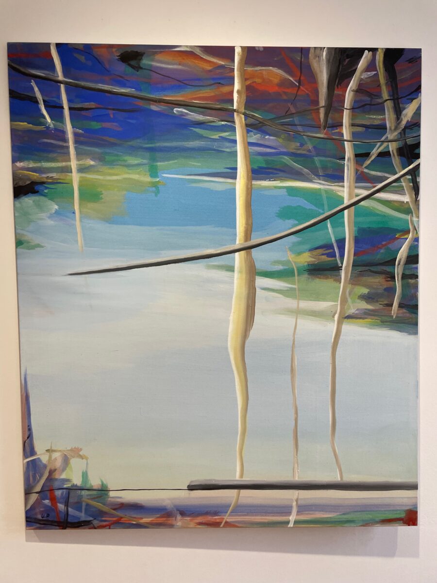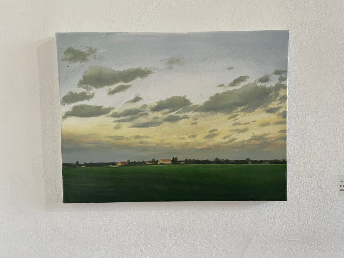 Einen spannenden Einblick geben die Grafiken der später 60er-/frühen 70er-Jahre: In den Radierungen bzw. Kaltnadelradierungen ist die Auflösung von Raum bereits angelegt. Des Weiteren treffen wir auf nordische Landschaften – mit hohem Himmel, mit in die Weite des Raumes gestreckter, erhabener Natur. Landschaften mit hohen, süßlichen Himmelsfarben von Sonnenauf- und -untergängen. Das alles mutet trefflich romantisch an, doch zum Glück verstellen uns Störer wie Satellitenschüsseln und anderes technisches Gerät den Weg des weichen Wegträumens. Auch die Kompositionen mit hohen Bäumen, Häusern, Fahrzeugen entziehen sich dem einfachen Zugriff durch Unschärfe, vermeintlich vertraute Heimat wie etwa die Hafenansicht aus Wewelsfleth löst sich jäh in Farbsplittern auf. Und schließlich lässt uns surreal anmutende Landschaftsmalerei in einem Wahrnehmungs-Schwebezustand zurück, irgendwo malerisch angelegt zwischen Wasser, Land, Spiegelungen und dann unvermittelt durchbrochen von stabähnlichen länglichen Flächen, die kein klares Unten und Oben erkennen lassen.