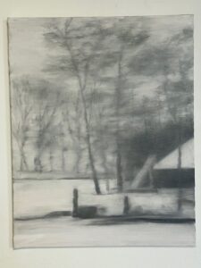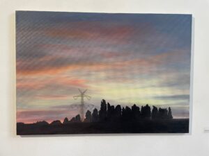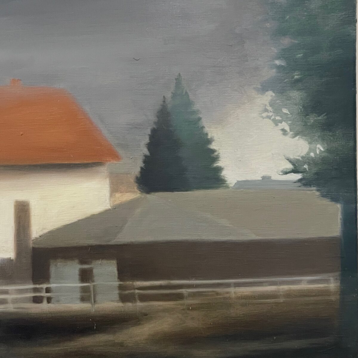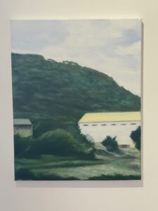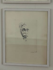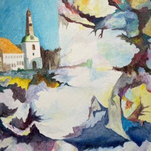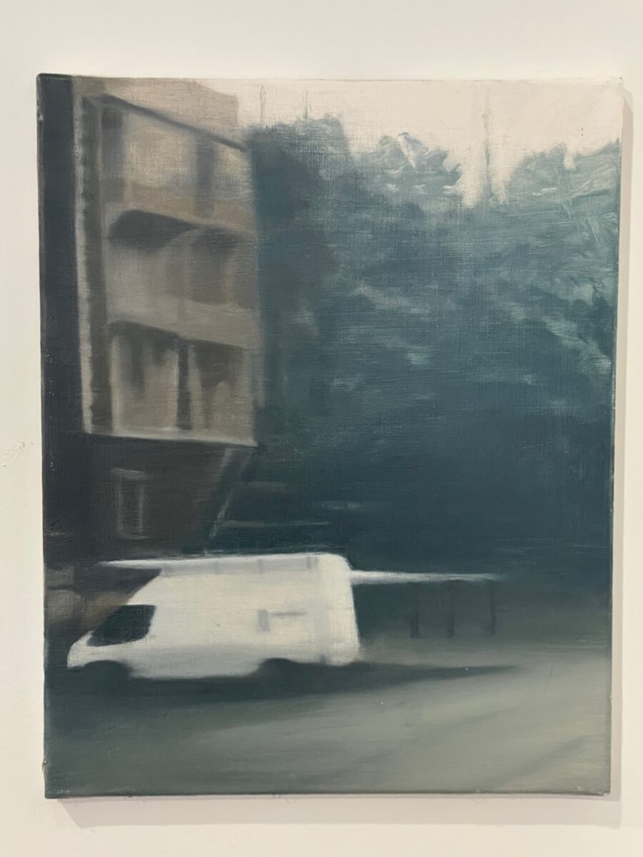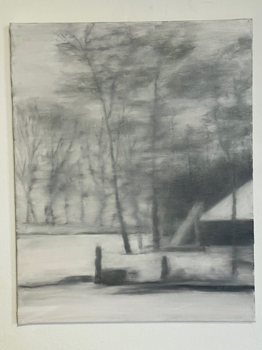 Einen spannenden Einblick geben die Grafiken der später 60er-/frühen 70er-Jahre: In den Radierungen bzw. Kaltnadelradierungen ist die Auflösung von Raum bereits angelegt. Des Weiteren treffen wir auf nordische Landschaften – mit hohem Himmel, mit in die Weite des Raumes gestreckter, erhabener Natur. Landschaften mit hohen, süßlichen Himmelsfarben von Sonnenauf- und -untergängen. Das alles mutet trefflich romantisch an, doch zum Glück verstellen uns Störer wie Satellitenschüsseln und anderes technisches Gerät den Weg des weichen Wegträumens. Auch die Kompositionen mit hohen Bäumen, Häusern, Fahrzeugen entziehen sich dem einfachen Zugriff durch Unschärfe, vermeintlich vertraute Heimat wie etwa die Hafenansicht aus Wewelsfleth löst sich jäh in Farbsplittern auf. Und schließlich lässt uns surreal anmutende Landschaftsmalerei in einem Wahrnehmungs-Schwebezustand zurück, irgendwo malerisch angelegt zwischen Wasser, Land, Spiegelungen und dann unvermittelt durchbrochen von stabähnlichen länglichen Flächen, die kein klares Unten und Oben erkennen lassen.